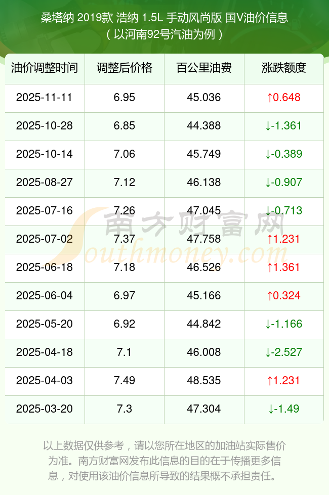 按照11月11日92號(hào)汽油最新調(diào)整價(jià)格6.95元/升來(lái)計(jì)算(以河南為例),該車型百公里平均油費(fèi)為45.036元,按照上一輪10月28日調(diào)整價(jià)格6.85元/升來(lái)計(jì)算,百公里平均油費(fèi)為44.388元,對(duì)比上一輪多花0.648元,下一輪油價(jià)調(diào)整時(shí)間為11月24日24時(shí)。