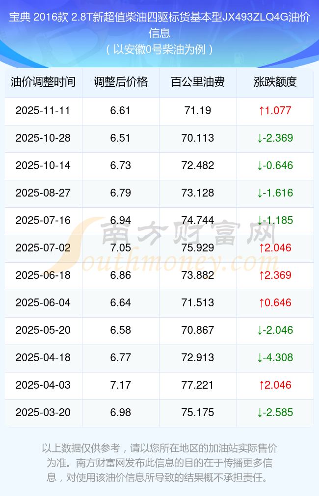 依照11月11日0號(hào)柴油最新調(diào)整價(jià)格6.61元/升來(lái)計(jì)算(以安徽為例),該車型百公里的平均油費(fèi)是71.19元,依照上一輪10月28日調(diào)整價(jià)格6.51元/升來(lái)計(jì)算,百公里的平均油費(fèi)是70.113元,對(duì)比上一輪多花1.077元,下一輪的油價(jià)調(diào)整時(shí)間11月24日24時(shí)。