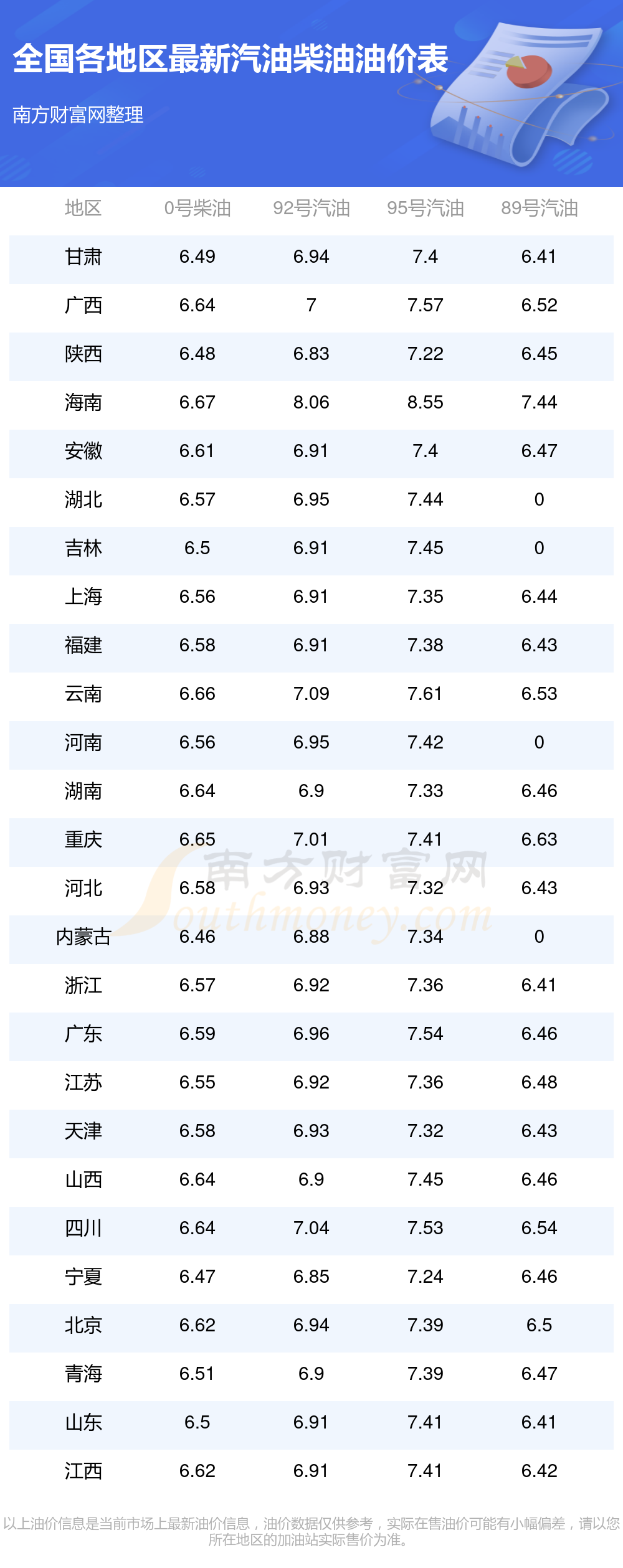 全國(guó)89號(hào)汽油最新平均價(jià)格為:7元每升,其中,最低為浙江,價(jià)格為6.41元/升,最高為海南,價(jià)格為7.44元/升。