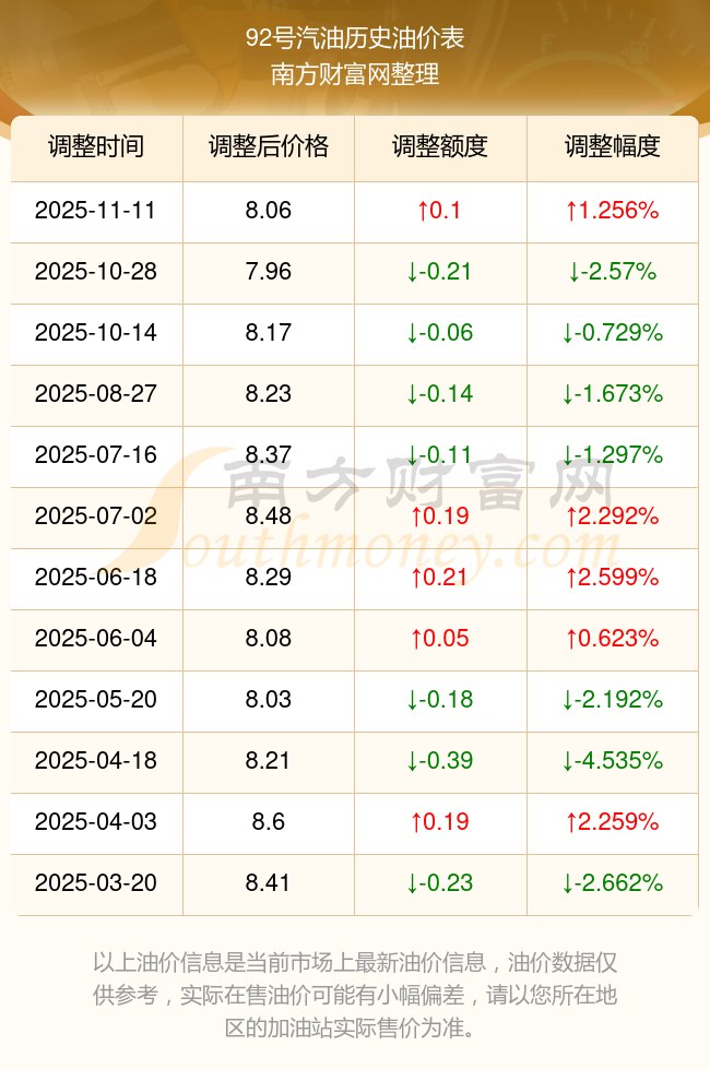汽油、柴油11月12日每升的價格是多少?具體為:92號汽油為8.06元,上升了0.1元;95號汽油為8.55元,上升了0.11元;89號汽油為7.44元,上升了0.09元;0號柴油為6.67元,上升了0.11元,本輪油價的調(diào)整時間為11月11日。下一輪油價調(diào)整時間11月24日24時,距離現(xiàn)在還有12.47天。