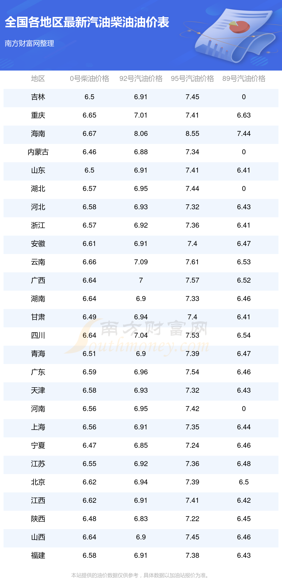 0號柴油平均價格:7元每升,其中,最高為海南,價格6.67元/升,最低為內(nèi)蒙古,價格6.46元/升。