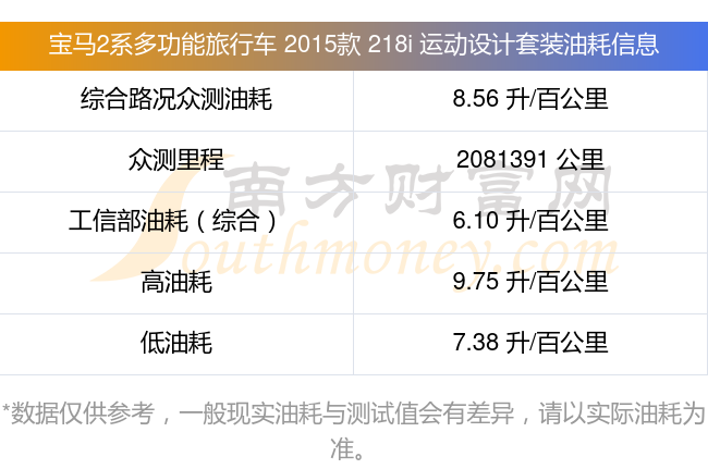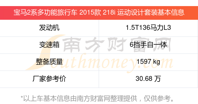 在動力上,寶馬2系多功能旅行車 2015款 218i 運(yùn)動設(shè)計(jì)套裝配備的是一臺1.5T136馬力L3渦輪增壓發(fā)動機(jī),匹配的是6擋手自一體自動檔變速箱,燃料形式為汽油,常規(guī)整備質(zhì)量1597kg,廠家參考價30.68萬元。