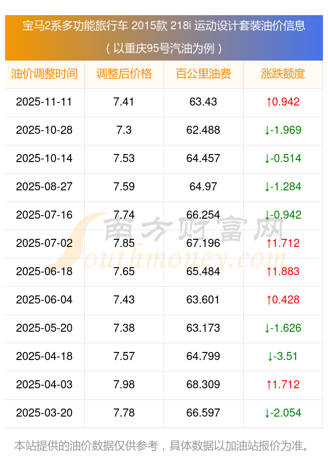 依照11月11日95號汽油最新調(diào)整價格7.41元/升來計(jì)算(以重慶為例),該車型百公里的平均油費(fèi)是63.43元,依照上一輪10月28日調(diào)整價格7.3元/升來計(jì)算,百公里的平均油費(fèi)是62.488元,對比上一輪多花0.942元,下一輪的油價調(diào)整時間11月24日24時。