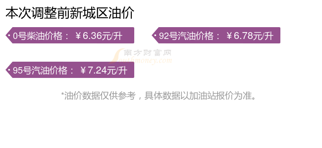新城區(qū)汽油、柴油11月12日每升的價(jià)格(油價(jià)調(diào)整時(shí)間11月11日):92號(hào)汽油6.88元;95號(hào)汽油7.34元;0號(hào)柴油6.46元。