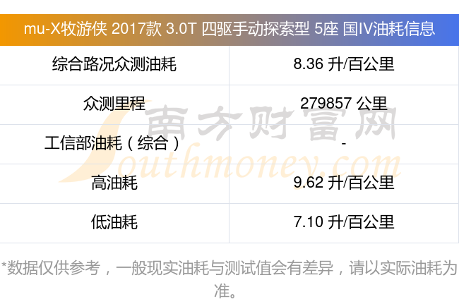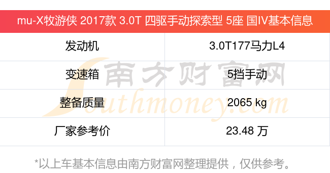 mu-X牧游俠 2017款 3.0T 四驅(qū)手動探索型 5座 國IV動力方面,搭載的是一臺3.0T177馬力L4渦輪增壓發(fā)動機,匹配5擋手動擋變速箱,燃料形式為柴油,常規(guī)整備質(zhì)量2065kg,廠家參考價23.48萬元。