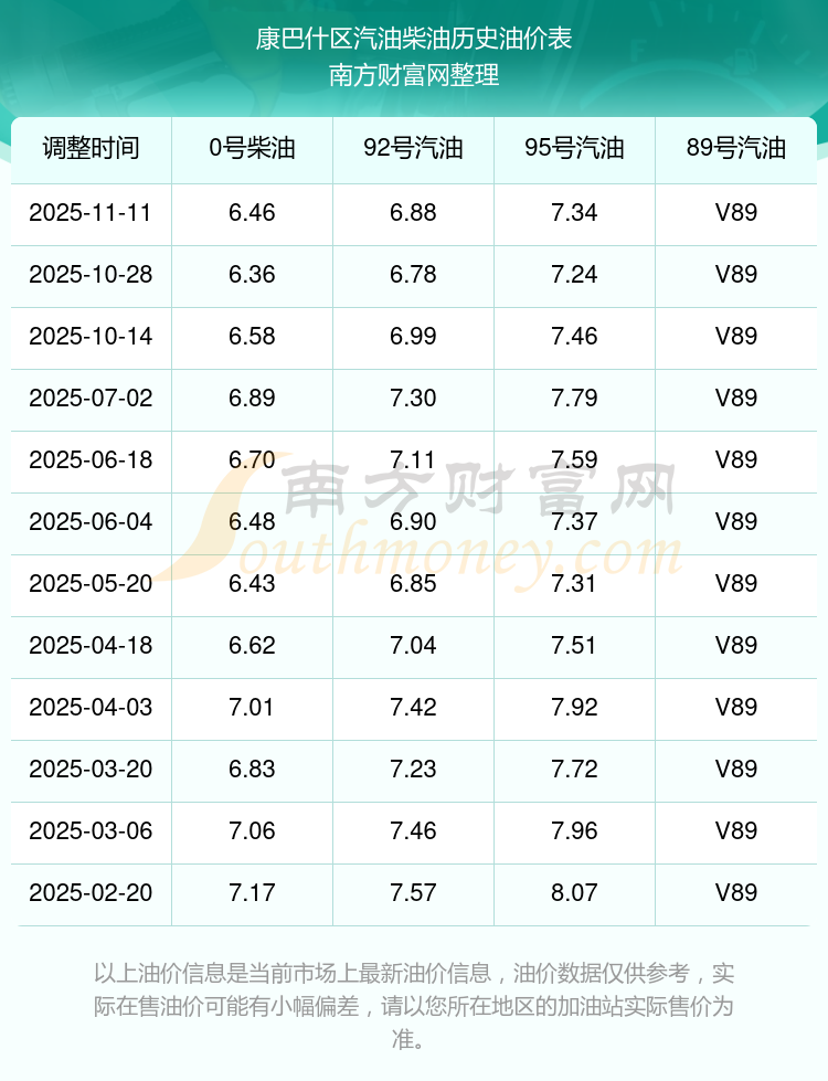 以上油價(jià)信息是當(dāng)前市場(chǎng)上最新油價(jià)信息,油價(jià)數(shù)據(jù)僅供參考,實(shí)際在售油價(jià)可能有小幅偏差,請(qǐng)以您所在地區(qū)的加油站實(shí)際售價(jià)為準(zhǔn)。