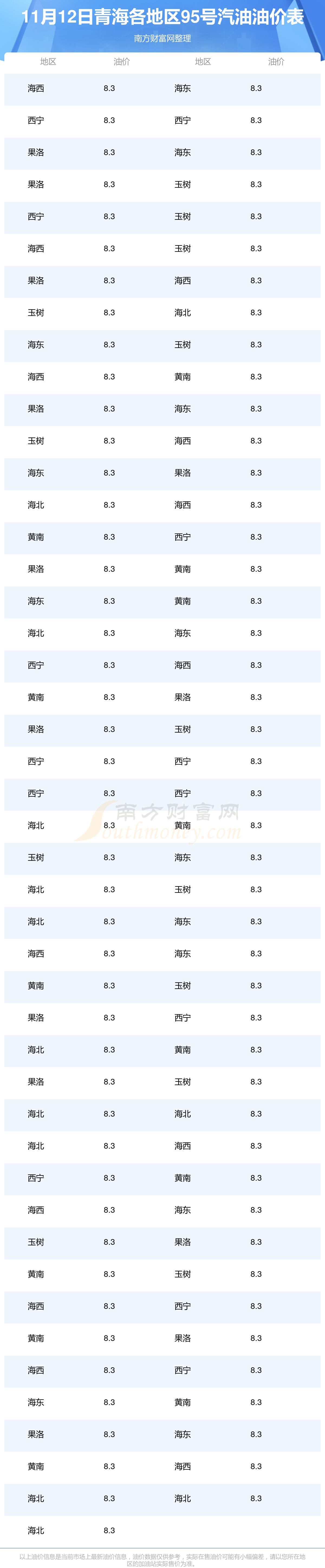 青海各地區(qū)最新95號(hào)汽油油價(jià)表
