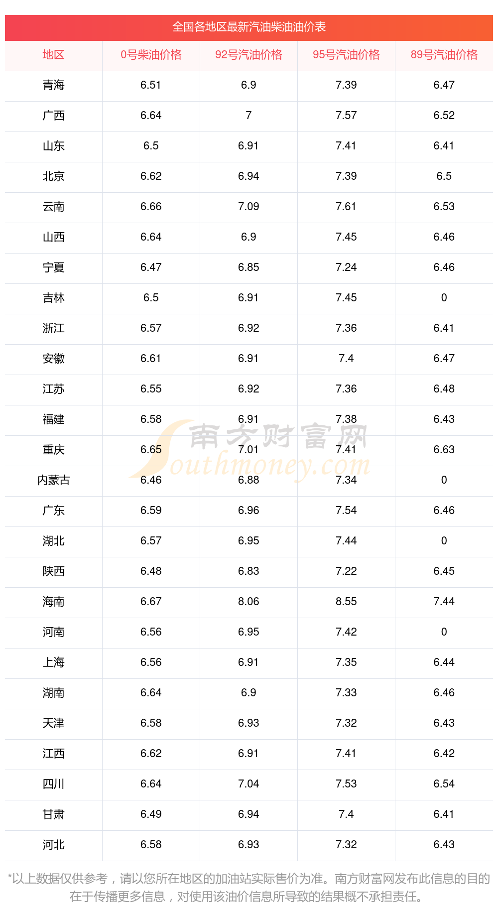油價數(shù)據(jù)僅供參考,請以您所在地區(qū)的加油站報價為準。南方財富網(wǎng)發(fā)布此信息的目的在于傳播更多信息,對使用該油價信息所導致的結果概不承擔任何責任。