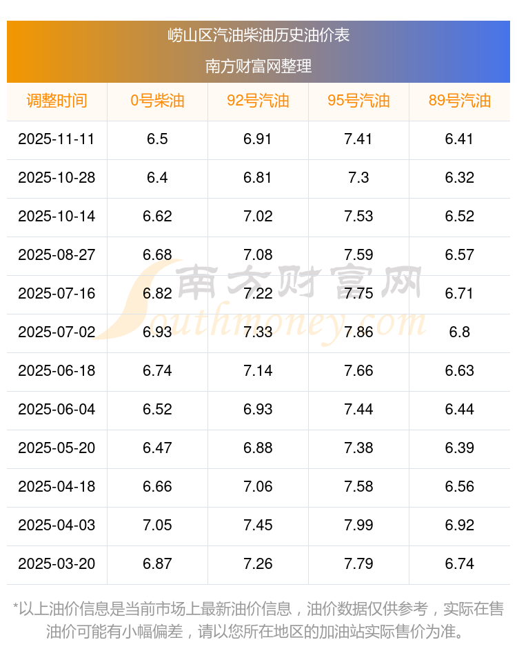 11月12日,嶗山區(qū)汽油、柴油每升最新價格:調(diào)整時間為11月11日,92號汽油為6.91元,上升了0.1元,上升幅達(dá)1.47%;95號汽油為7.41元,上升了0.11元,上升幅達(dá)1.51%;89號汽油為6.41元,上升了0.09元,上升幅達(dá)1.42%;0號柴油為6.5元,上升了0.1元,上升幅達(dá)1.56%。