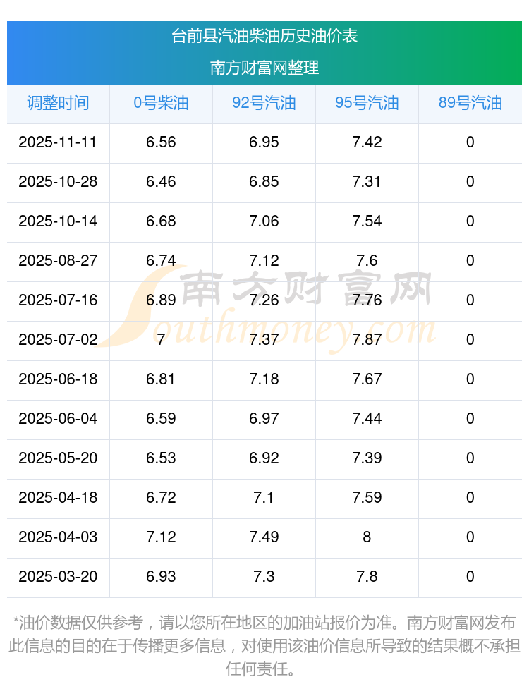 臺前縣汽油、柴油11月12日每升的價格為:92號汽油6.95元;95號汽油7.42元;0號柴油6.56元,本次油價調整時間是11月11日。