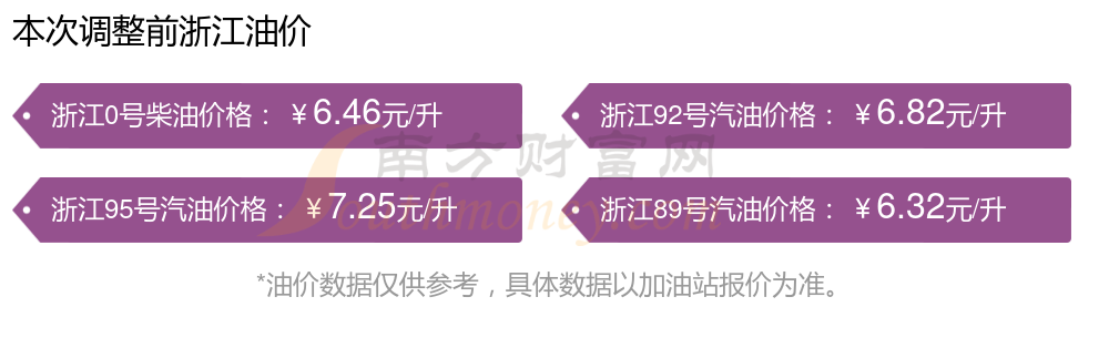 11月12日,浙江汽油、柴油價格的調(diào)整時間為11月11日。每升最新價格為:92號汽油為6.92元,增了0.1元;95號汽油為7.36元,增了0.11元;89號汽油為6.41元,增了0.09;0號柴油為6.57元,增了0.11元。