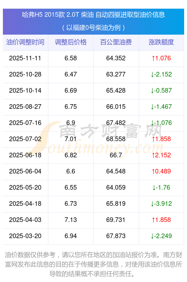 根據(jù)11月11日0號(hào)柴油最新調(diào)整價(jià)格6.58元/升來計(jì)算(以福建為例),該車型每百公里的平均油費(fèi)是64.352元,上一輪10月28日調(diào)整價(jià)格6.47元每升來計(jì)算,每百公里的平均油費(fèi)是63.277元,對(duì)比上一輪多花1.076元,下一輪的油價(jià)調(diào)整時(shí)間是11月24日24時(shí)。