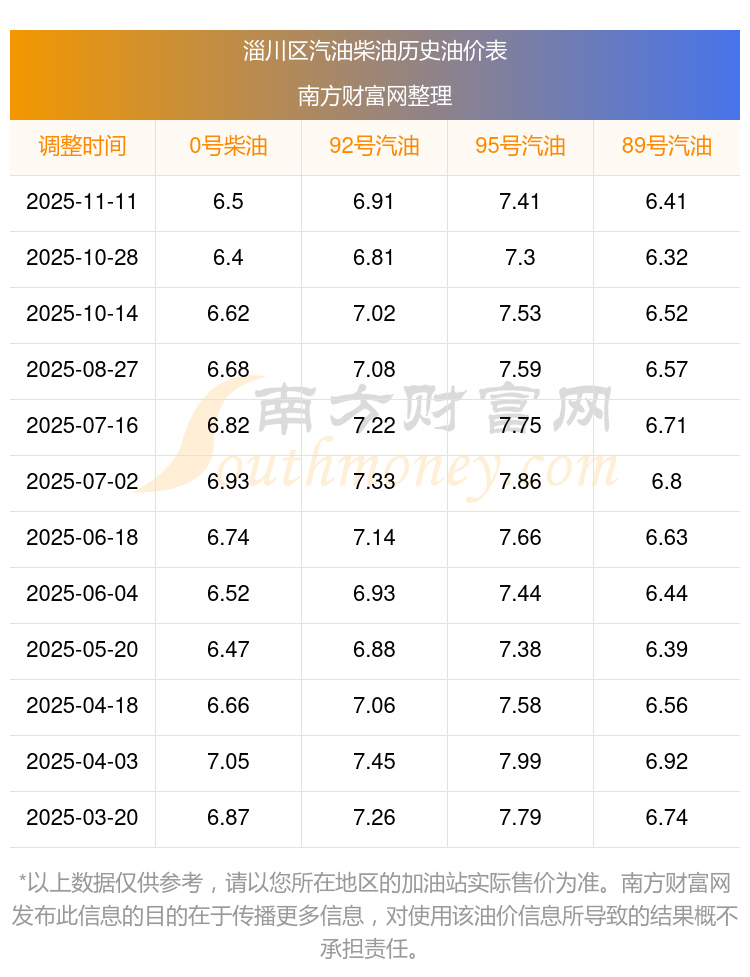 11月12日淄川區(qū)汽油、柴油每升的價(jià)格是多少?詳情如下:95號汽油為7.41元,上調(diào)了0.11元;92號汽油為6.91元,上調(diào)了0.1元;89號汽油為6.41元,上調(diào)了0.09元;0號柴油為6.5元,上調(diào)了0.1元,調(diào)整時(shí)間為11月11日。