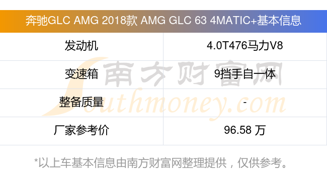 奔馳GLC AMG 2018款 AMG GLC 63 4MATIC+動(dòng)力上搭載的是一臺(tái)4.0T476馬力V8雙渦輪增壓發(fā)動(dòng)機(jī),匹配9擋手自一體自動(dòng)檔變速箱,燃料形式為汽油,廠家參考價(jià)96.58萬元。