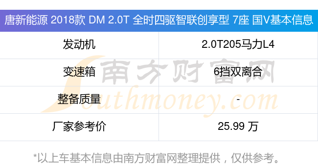 在動力上,唐新能源 2018款 DM 2.0T 全時(shí)四驅(qū)智聯(lián)創(chuàng)享型 7座 國V配備的是一臺2.0T205馬力L4渦輪增壓發(fā)動機(jī),匹配的是6擋雙離合自動檔變速箱,燃料形式為插電式混合動力,廠家參考價(jià)25.99萬元。