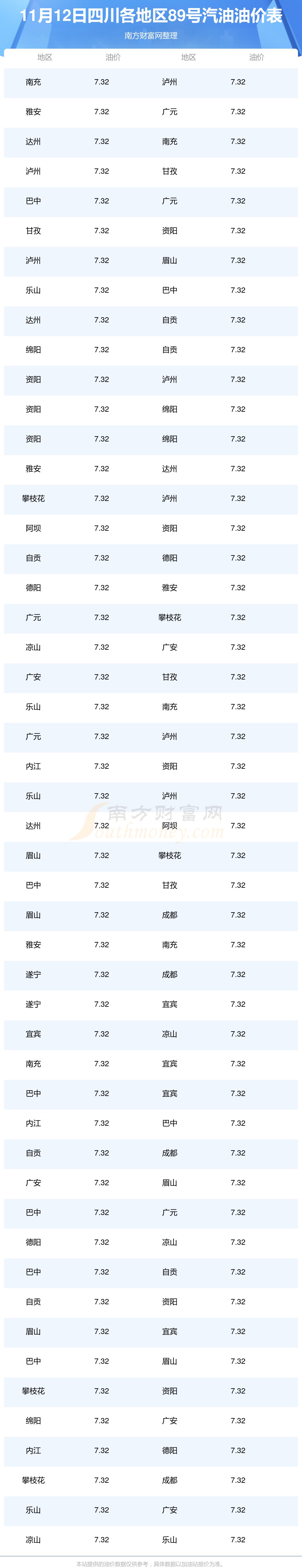 11月12日,四川89號汽油的價格是6.54元每升,本次的調(diào)整時間為11月11日,對比上次的調(diào)整增了0.1元,增1.553%,11月24日24時為下一輪油價調(diào)整時間,還有12.42天。