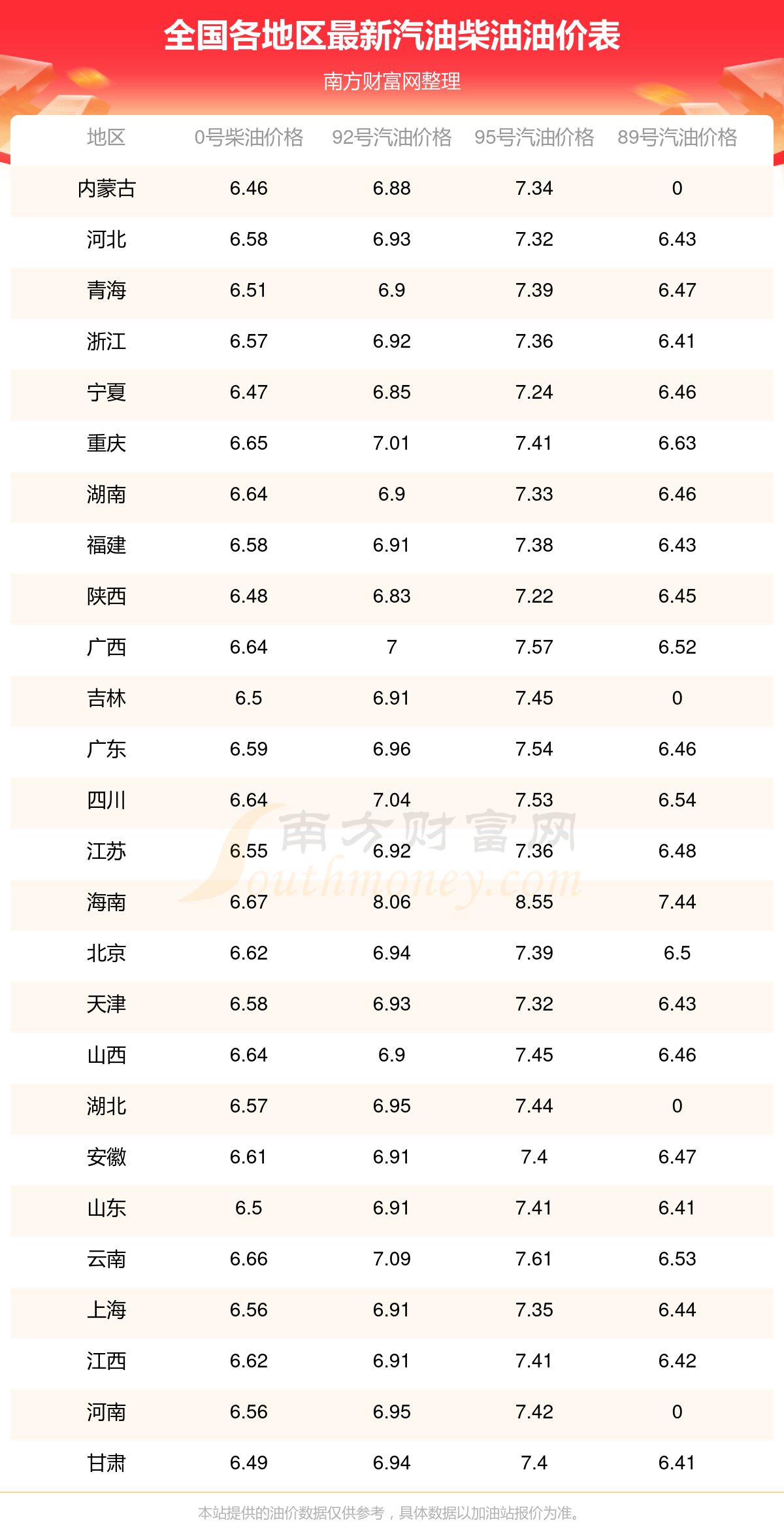 2025年全國(guó)各地區(qū)汽油價(jià)格表