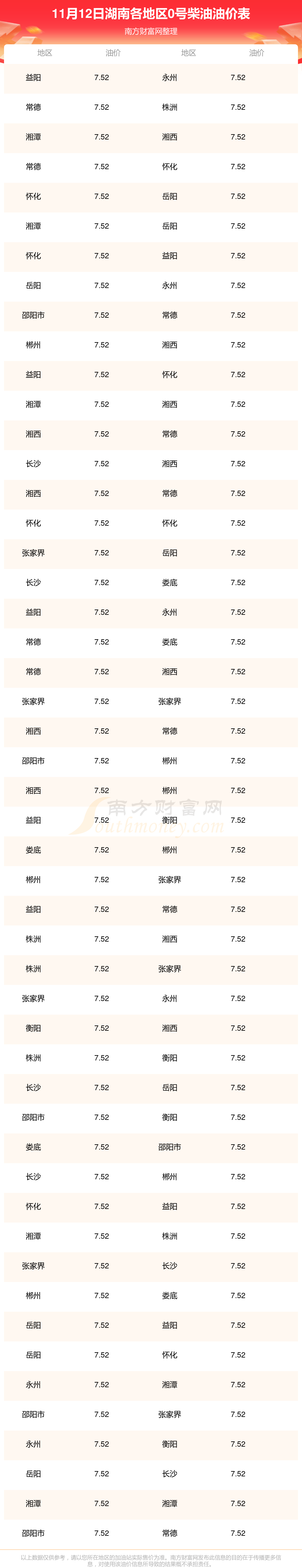 湖南各地區(qū)最新0號柴油油價(jià)表