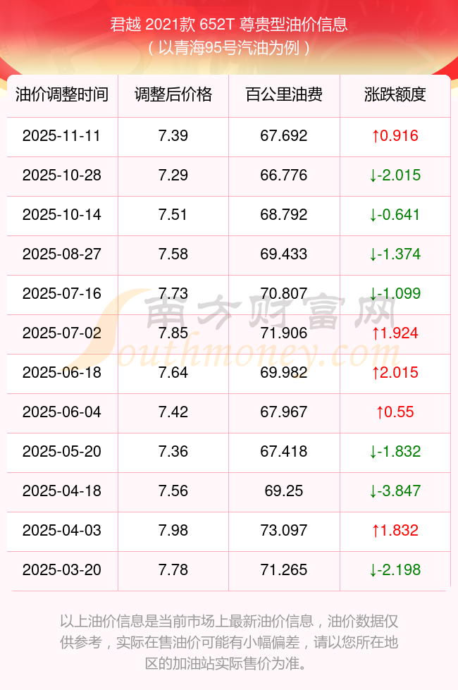 依照11月11日95號汽油最新調(diào)整價格7.39元/升來計(jì)算(以青海為例),該車型百公里的平均油費(fèi)是67.692元,依照上一輪10月28日調(diào)整價格7.29元/升來計(jì)算,百公里的平均油費(fèi)是66.776元,對比上一輪多花0.916元,下一輪的油價調(diào)整時間11月24日24時。