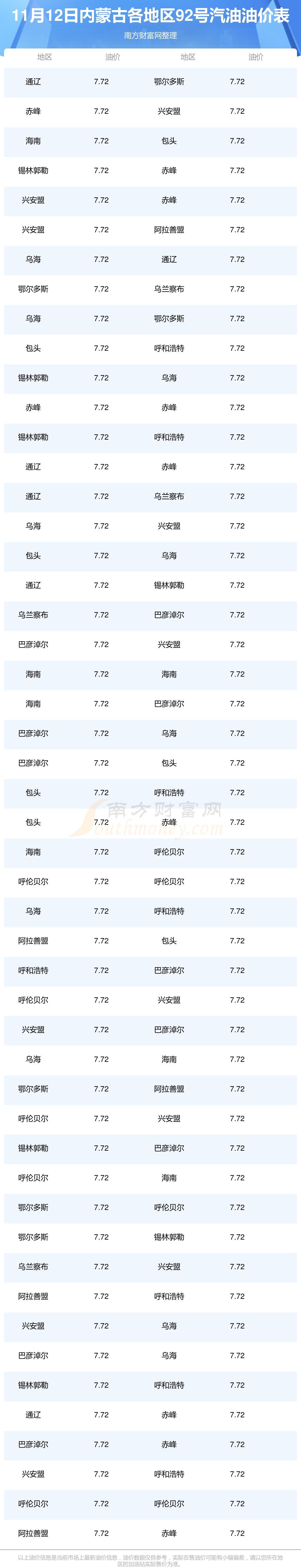 2025年11月12日內(nèi)蒙古92號汽油最新價格一覽表
