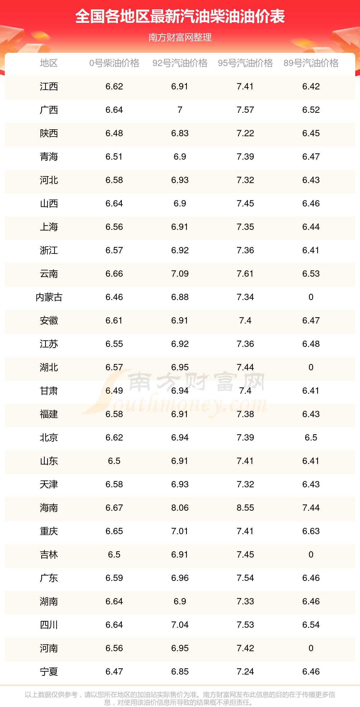 2025年全國各地區(qū)最新油價表