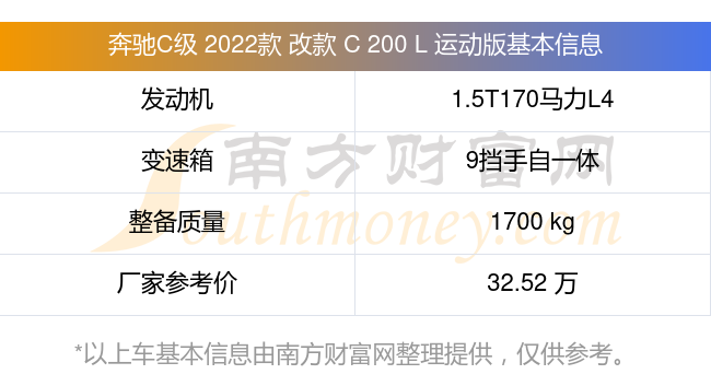 在動力上,奔馳C級 2022款 改款 C 200 L 運動版配備的是一臺1.5T170馬力L4渦輪增壓發(fā)動機(jī),匹配的是9擋手自一體自動檔變速箱,燃料形式為汽油+48V輕混系統(tǒng),常規(guī)整備質(zhì)量1700kg,廠家參考價32.52萬元。