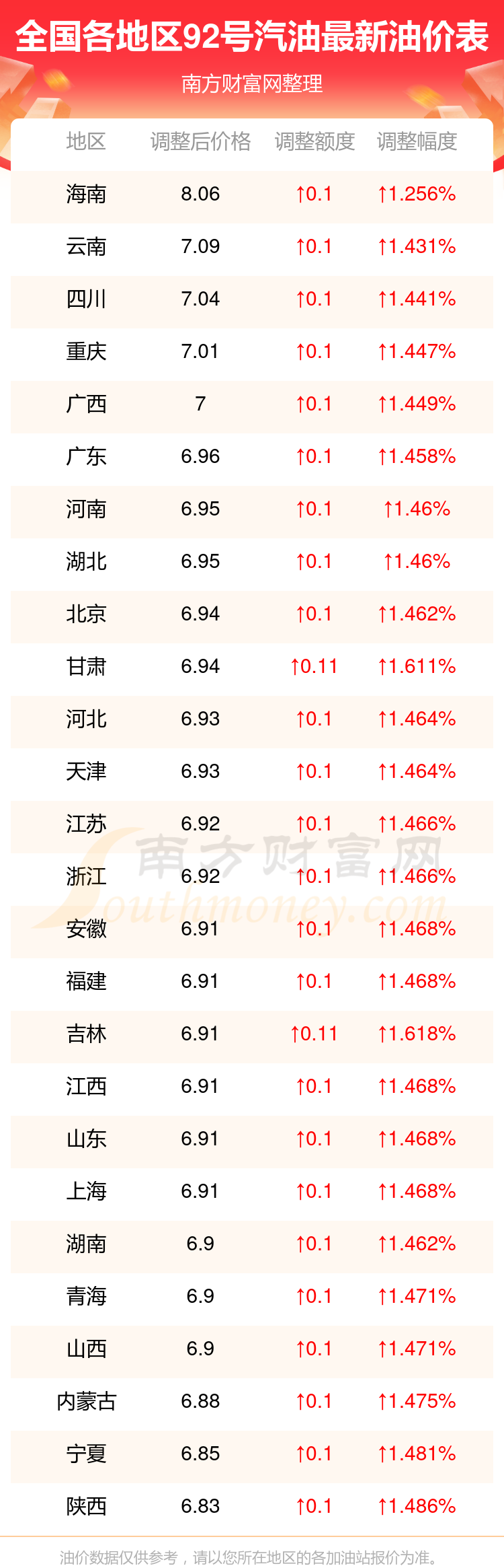 11月12日,全國92號汽油最新平均價格為:7元每升,調(diào)整時間為11月11日,其中,全國92號汽油最低為陜西,價格為6.83元/升,92號汽油最高為海南,價格為8.06元/升。