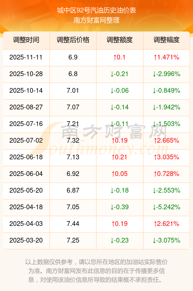 城中區(qū)92號(hào)汽油歷史油價(jià)一覽表