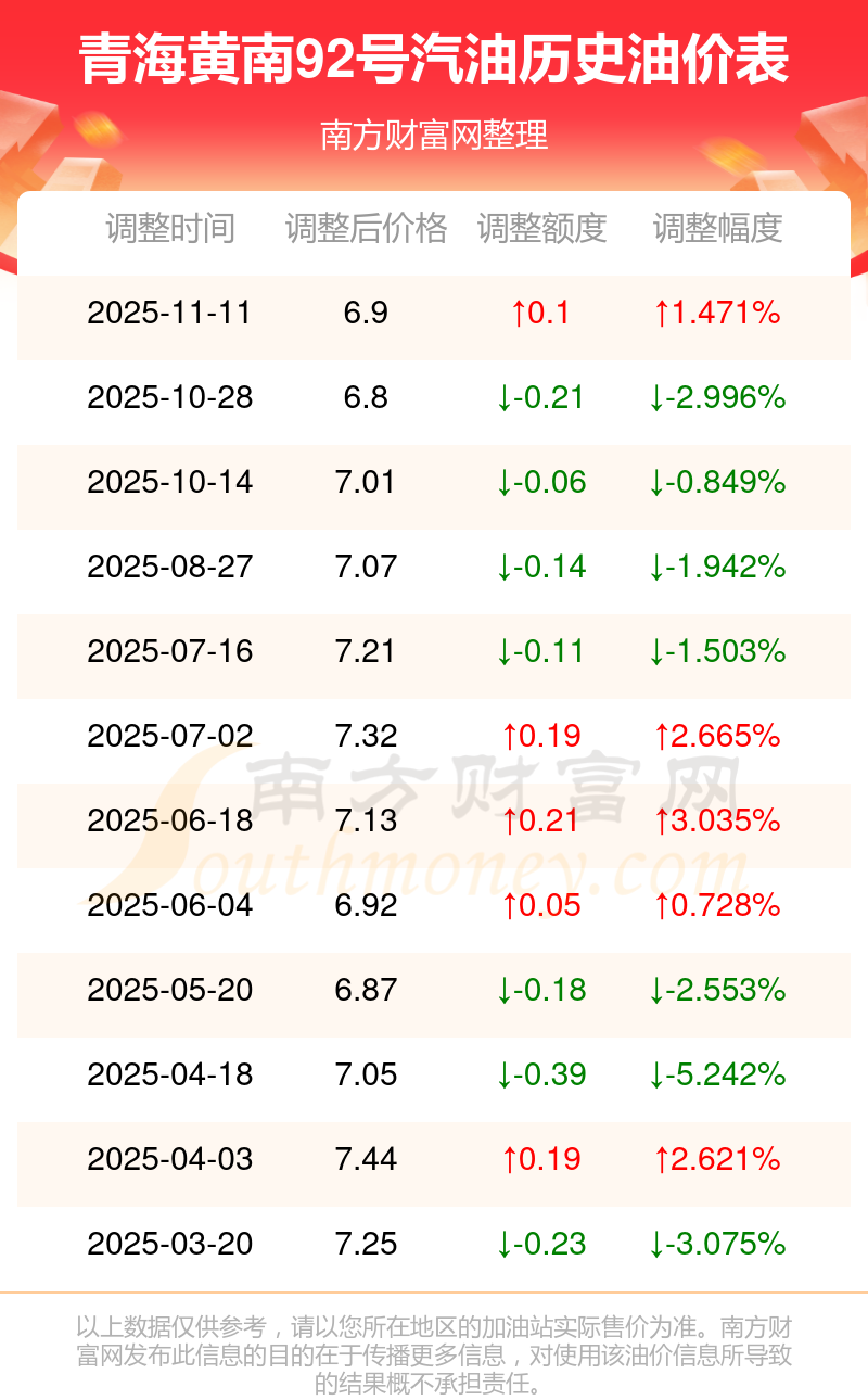 2025年92號(hào)汽油價(jià)格調(diào)整一覽表