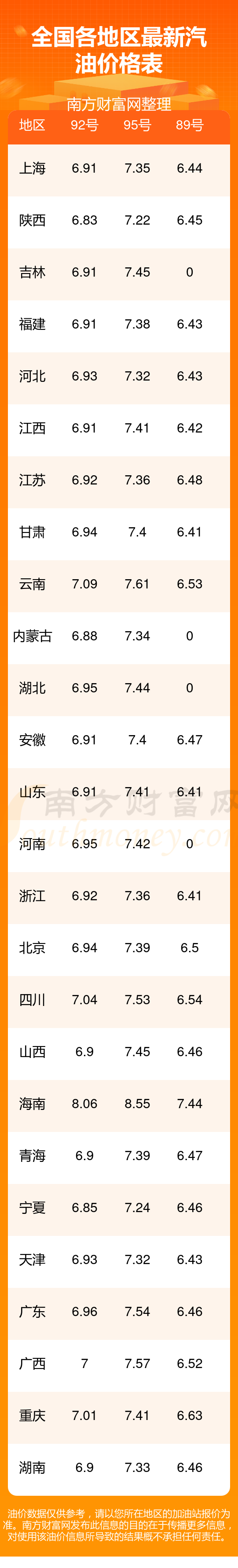 89號(hào)汽油平均價(jià)格:7元每升,其中,最高為海南,價(jià)格為7.44元/升,最低為浙江,價(jià)格為6.41元/升。