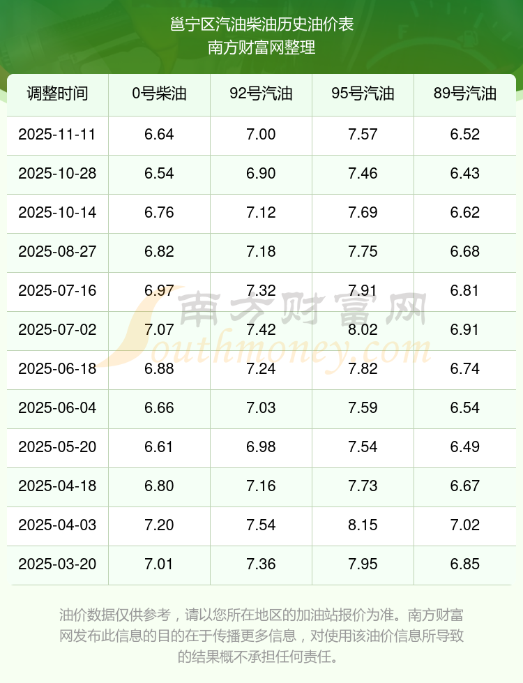油價調(diào)整最新消息:下一輪油價調(diào)整時間11月24日24時。11月12日邕寧區(qū)汽油柴油每升的價格為11月11日調(diào)整后的價格,具體如下:92號汽油7元;95號汽油7.57元;89號汽油6.52元;0號柴油6.64元。