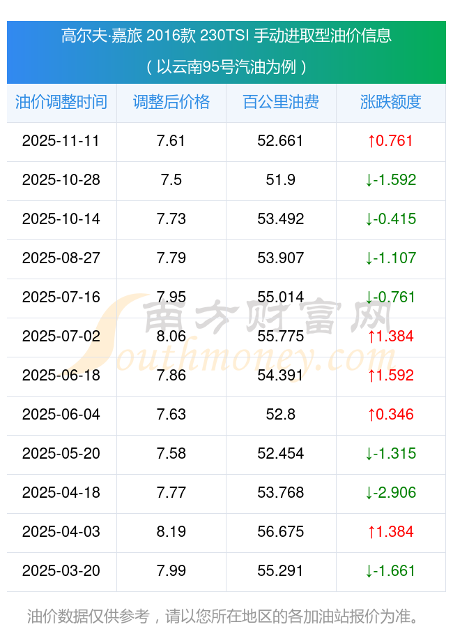 按11月11日95號汽油最新調(diào)整價格7.61元每升來計算(以云南為例),該車型百公里平均油費為52.661元,按上一輪10月28日調(diào)整價格7.5元每升來計算,百公里平均油費為51.9元,對比上一輪多花0.761元,下一輪油價調(diào)整時間為11月24日24時。