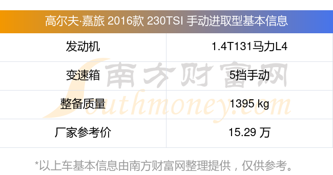 高爾夫·嘉旅 2016款 230TSI 手動進取型動力上搭載的是一臺1.4T131馬力L4渦輪增壓發(fā)動機,匹配5擋手動擋變速箱,燃料形式為汽油,常規(guī)整備質(zhì)量1395kg,廠家參考價15.29萬元。