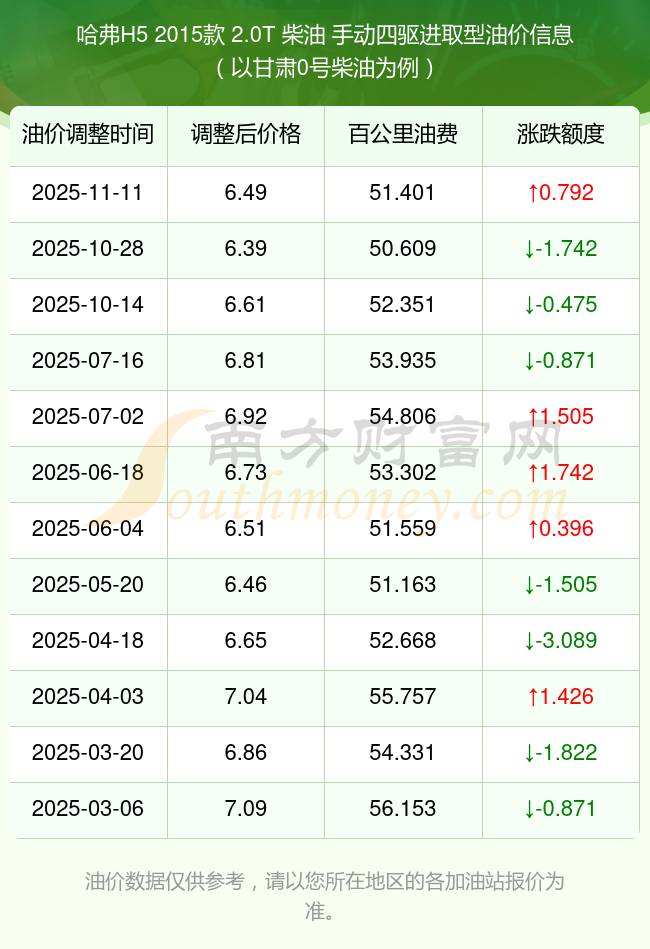 根據(jù)11月11日0號柴油最新調(diào)整價格6.49元/升來計算(以甘肅為例),該車型每百公里的平均油費是51.401元,上一輪10月28日調(diào)整價格6.39元每升來計算,每百公里的平均油費是50.609元,對比上一輪多花0.792元,下一輪的油價調(diào)整時間是11月24日24時。