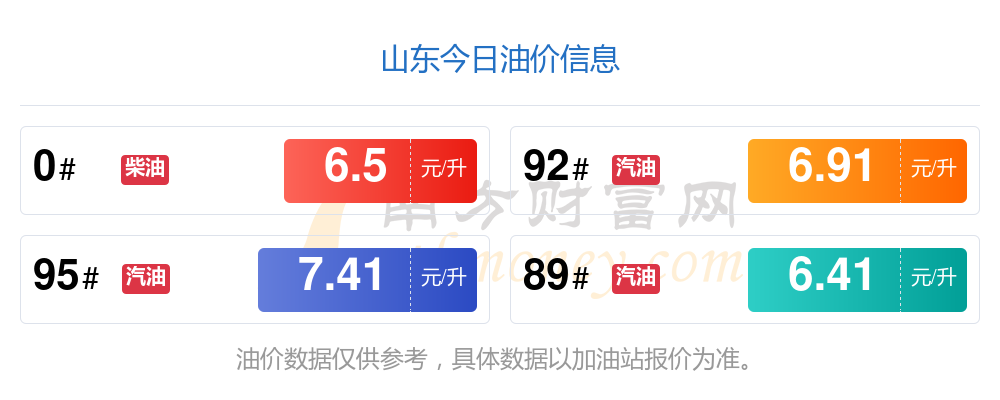 11月12日,山東汽油、柴油的價格為11月11日調(diào)整后的價格。具體為:92號汽油6.91元,上調(diào)了0.1元;95號汽油7.41元,上調(diào)了0.11元;89號汽油6.41元,上調(diào)了0.09;0號柴油6.5元,上調(diào)了0.1元。