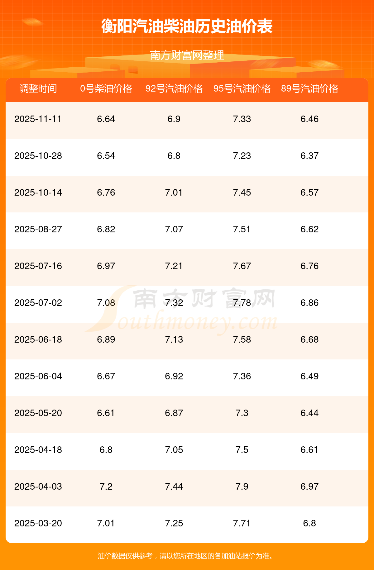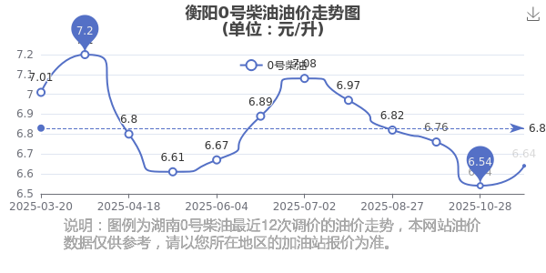 衡陽(yáng)汽油、柴油11月12日每升的價(jià)格具體是(11月11日調(diào)整后的價(jià)格):92號(hào)汽油6.9元;95號(hào)汽油7.33元;89號(hào)汽油6.46元;0號(hào)柴油6.64元。