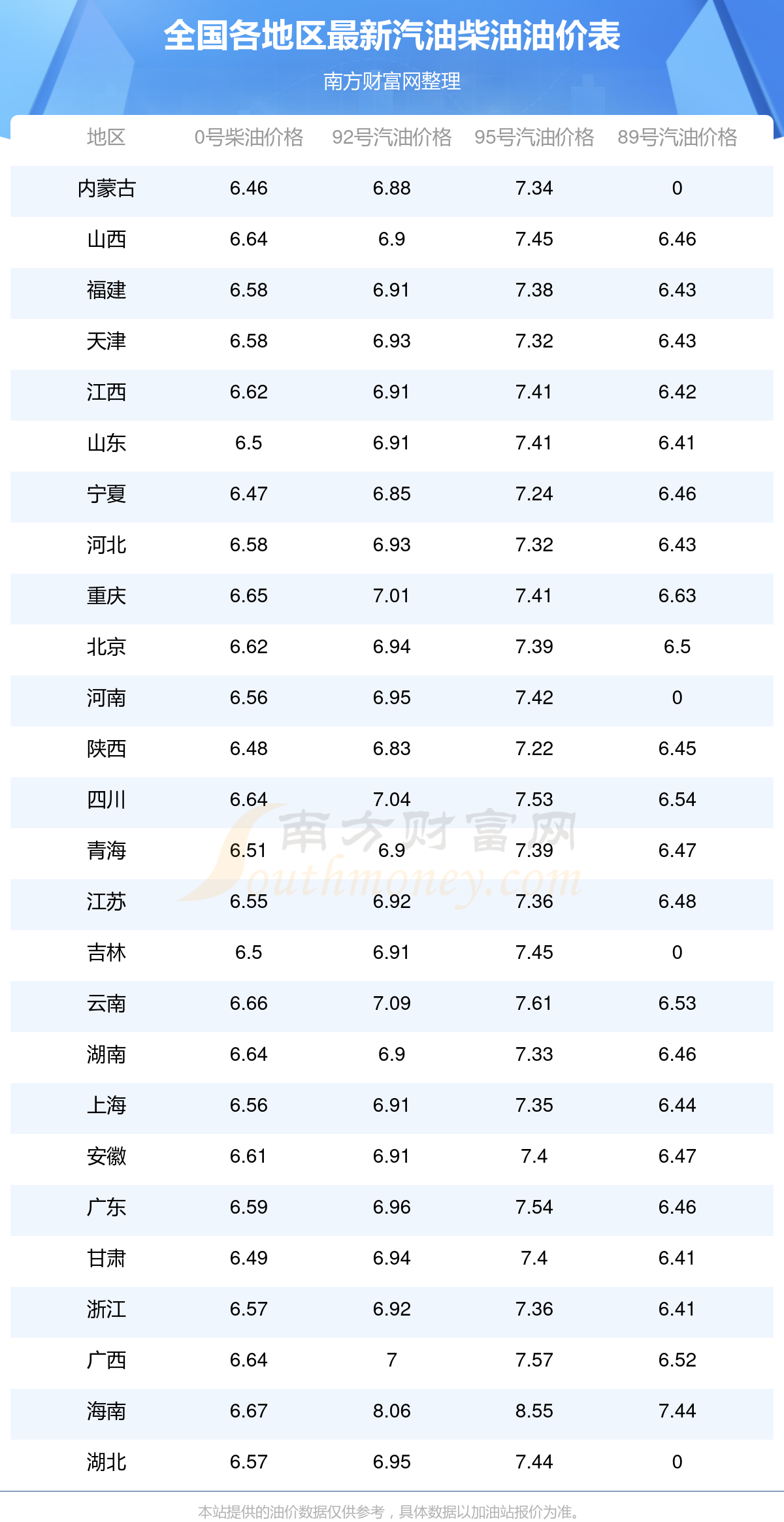 以上數(shù)據(jù)僅供參考,請以您所在地區(qū)的加油站實際售價為準。南方財富網(wǎng)發(fā)布此信息的目的在于傳播更多信息,對使用該油價信息所導致的結(jié)果概不承擔責任。