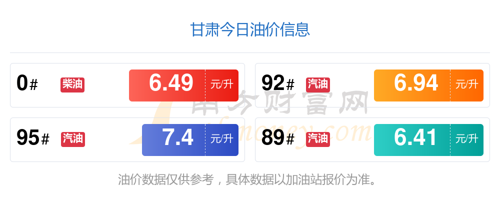 甘肅汽油、柴油11月12日每升最新價格為:92號汽油為6.94元;95號汽油為7.4元;89號汽油為6.41元,上升了0.09;0號柴油為6.49元,調(diào)整時間為11月11日。