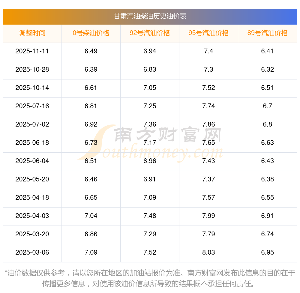 甘肅2025年最新汽油柴油歷史油價表
