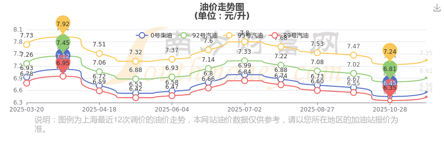 上海汽油柴油11月12日的價格每升多少錢?具體為:92號汽油為6.91元,升了0.1元;95號汽油為7.35元,升了0.11元;89號汽油為6.44元,升了0.09元;0號柴油為6.56元,升了0.11元,本輪油價的調(diào)整時間為11月11日。