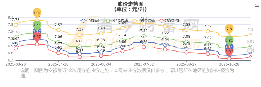 11月12日蕪湖95號汽油的價格是7.4元/升(油價調(diào)整時間11月11日),相對上一輪油價調(diào)整時間10月28日的價格7.3元/升,增了0.1元,增幅達1.37%。下一輪油價調(diào)整時間11月24日24時,距離現(xiàn)在還有12.34天。