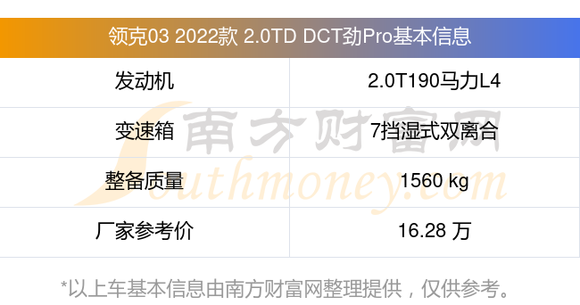 在動(dòng)力方面,領(lǐng)克03 2022款 2.0TD DCT勁Pro搭載的是一臺(tái)2.0T190馬力L4渦輪增壓發(fā)動(dòng)機(jī),匹配7擋濕式雙離合自動(dòng)檔變速箱,燃料形式為汽油,常規(guī)整備質(zhì)量1560kg,廠家參考價(jià)16.28萬(wàn)元。