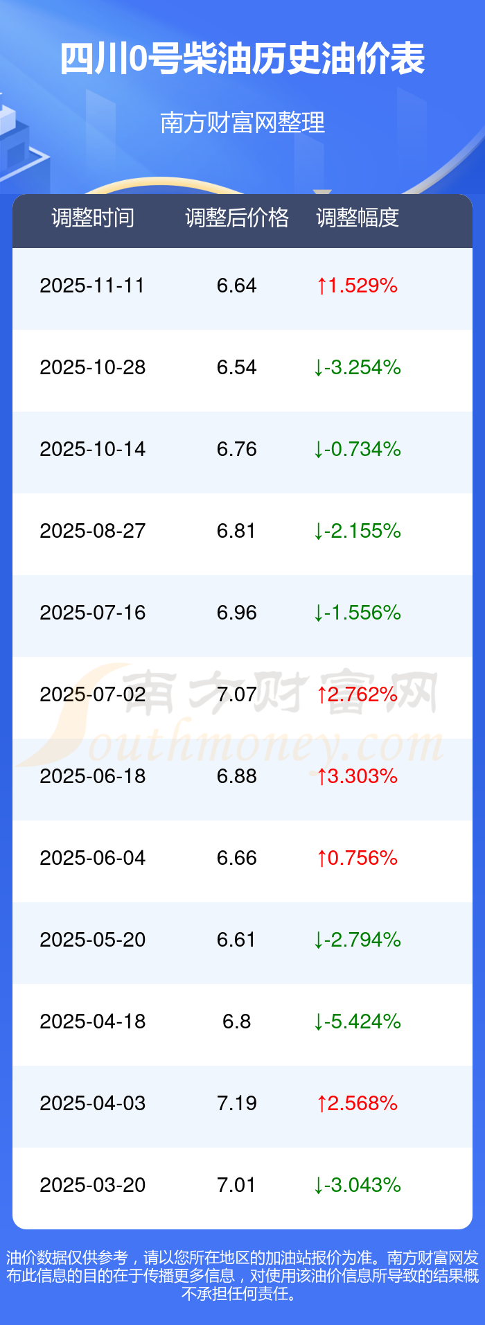 11月12日四川0號柴油價格是11月11日調(diào)整后的價格,為6.64元每升,相對上一輪調(diào)整時間10月28日的油價6.54元/升,上漲了0.1元。