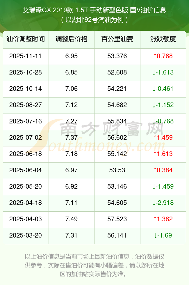 按11月11日92號(hào)汽油最新調(diào)整價(jià)格6.95元每升來(lái)計(jì)算(以湖北為例),該車(chē)型百公里平均油費(fèi)為53.376元,按上一輪10月28日調(diào)整價(jià)格6.85元每升來(lái)計(jì)算,百公里平均油費(fèi)為52.608元,對(duì)比上一輪多花0.768元,下一輪油價(jià)調(diào)整時(shí)間為11月24日24時(shí)。