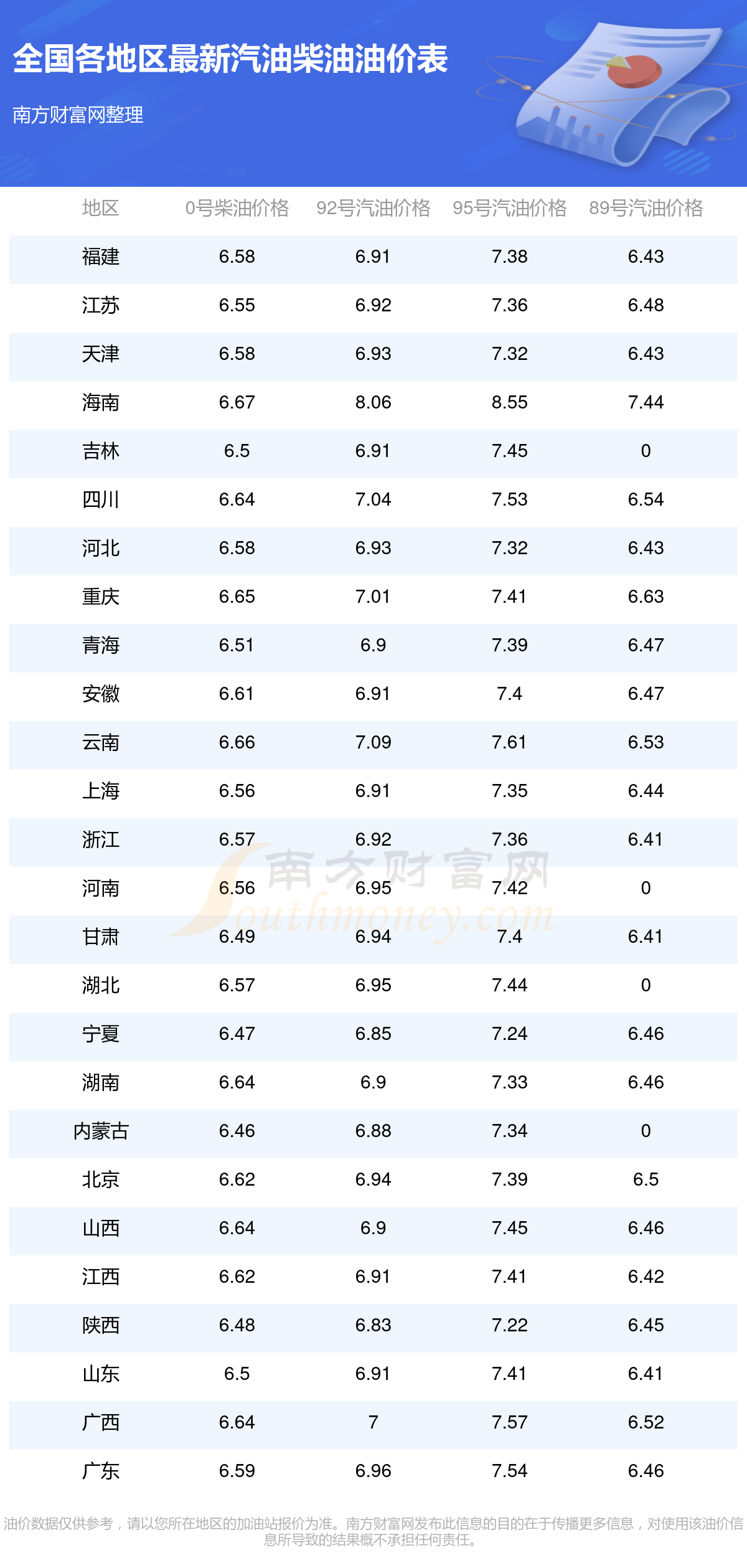 油價(jià)數(shù)據(jù)僅供參考,請以您所在地區(qū)的加油站報(bào)價(jià)為準(zhǔn)。南方財(cái)富網(wǎng)發(fā)布此信息的目的在于傳播更多信息,對使用該油價(jià)信息所導(dǎo)致的結(jié)果概不承擔(dān)任何責(zé)任。