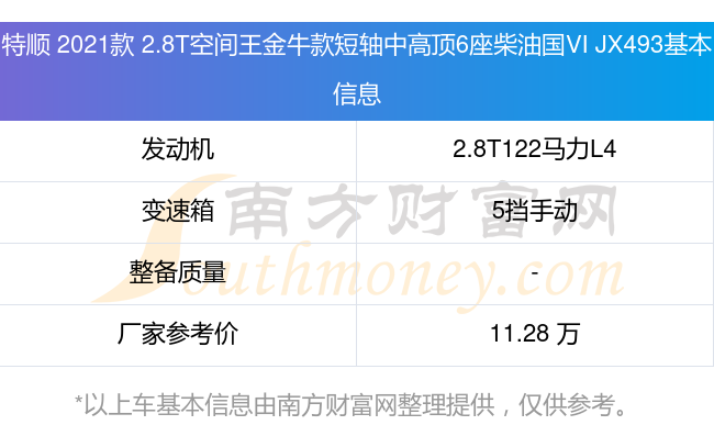 特順 2021款 2.8T空間王金?疃梯S中高頂6座柴油國(guó)VI JX493搭載了一臺(tái)2.8T122馬力L4渦輪增壓發(fā)動(dòng)機(jī),采用5擋手動(dòng)擋變速箱,廠家參考價(jià)11.28萬(wàn)元。