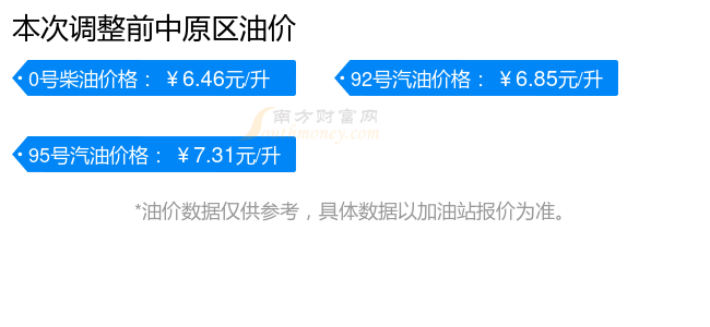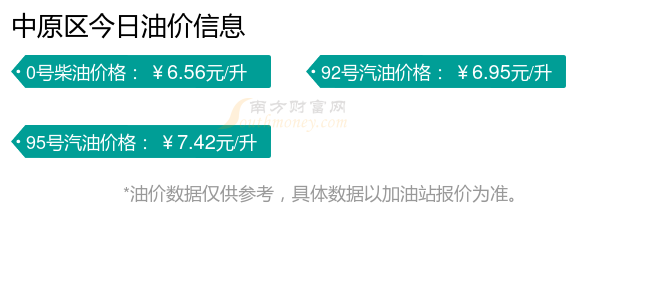 中原區(qū)汽油、柴油11月12日每升的價(jià)格是多少?具體為:92號(hào)汽油為6.95元,上漲了0.1元;95號(hào)汽油為7.42元,上漲了0.11元;0號(hào)柴油為6.56元,上漲了0.1元,本輪油價(jià)的調(diào)整時(shí)間為11月11日。