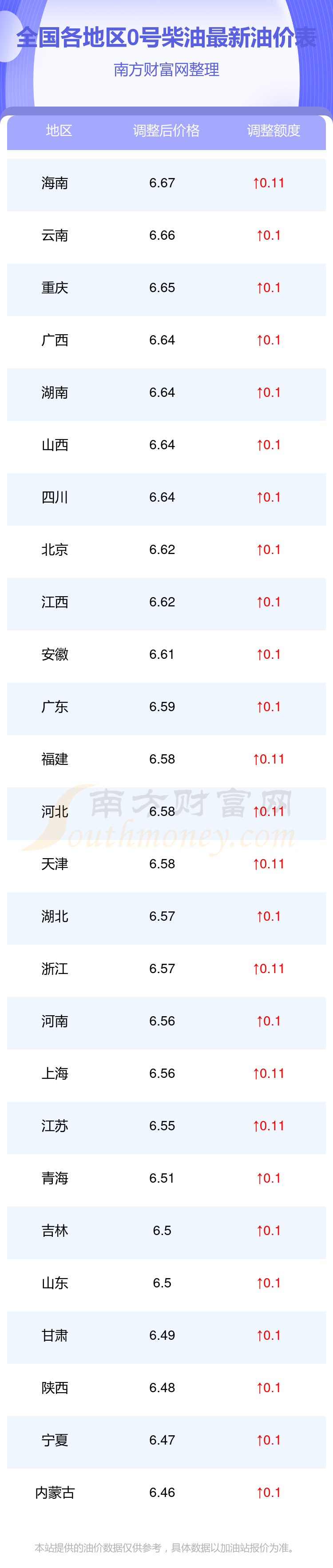 全國0號柴油11月12日的價格多少錢一升?11月11日油價調(diào)整后,詳情如下:平均價格為7元/升,最低的是內(nèi)蒙古,價格6.46元/升,最高的是海南,價格6.67元/升。