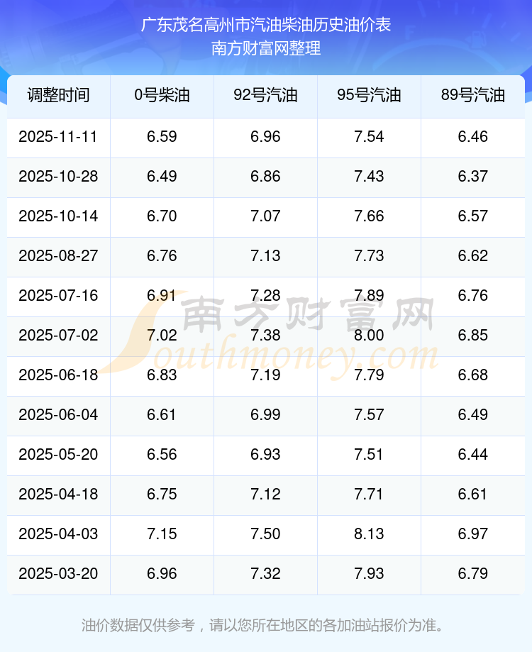廣東茂名高州市汽油、柴油11月12日每升的價(jià)格是多少?11月11日調(diào)整后的價(jià)格詳情如下:92號(hào)汽油6.96元;95號(hào)汽油7.54元;89號(hào)汽油6.46元;0號(hào)柴油6.59元。