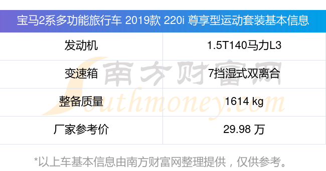 寶馬2系多功能旅行車 2019款 220i 尊享型運(yùn)動(dòng)套裝動(dòng)力上搭載的是一臺(tái)1.5T140馬力L3渦輪增壓發(fā)動(dòng)機(jī),匹配7擋濕式雙離合自動(dòng)檔變速箱,燃料形式為汽油,常規(guī)整備質(zhì)量1614kg,廠家參考價(jià)29.98萬元。